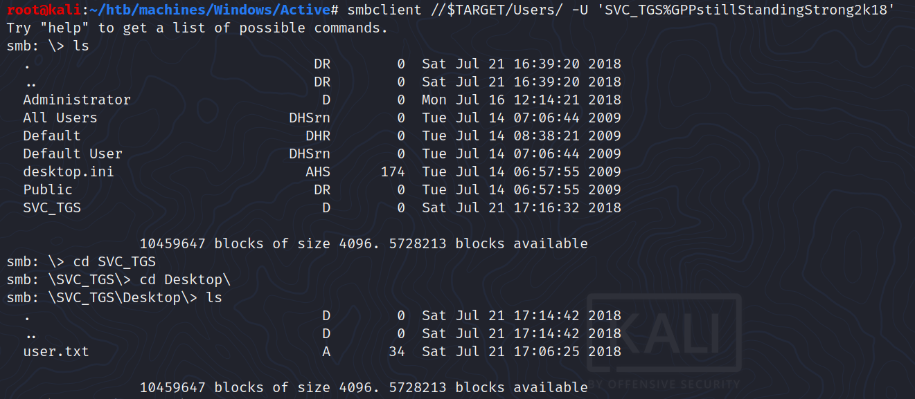 <Groups clsid="{3125E937-EB16-4b4c-9934-544FC6D24D26}"><User clsid="{DF5F1855-51E5-4d24-8B1A-D9BDE98BA1D1}" name="active.htb\SVC_TGS" image="2" changed="2018-07-18 20:46:06" uid="{EF57DA28-5F69-4530-A59E-AAB58578219D}"><Properties action="U" newName="" fullName="" description="" cpassword="edBSHOwhZLTjt/QS9FeIcJ83mjWA98gw9guKOhJOdcqh+ZGMeXOsQbCpZ3xUjTLfCuNH8pG5aSVYdYw/NglVmQ" changeLogon="0" noChange="1" neverExpires="1" acctDisabled="0" userName="active.htb\SVC_TGS"/></User>