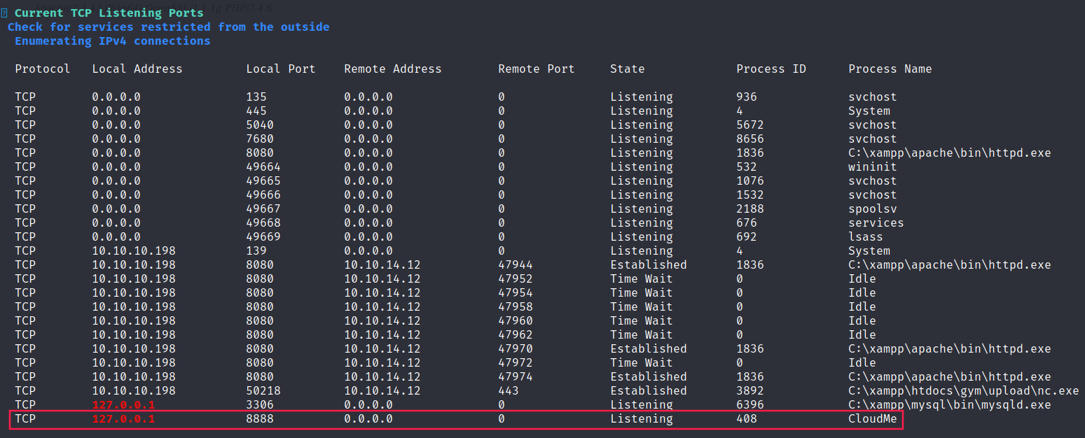Using winPEAS we can see that there is an app called CloudMe which is running on local port 8888 but is not running on remote port.