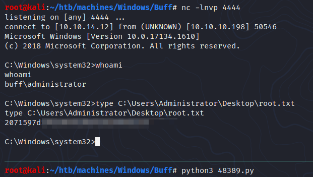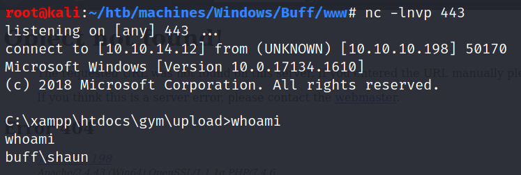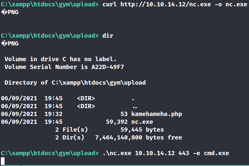 We can upgrade our shell to a more stable shell by uploading nc.exe and executing it: